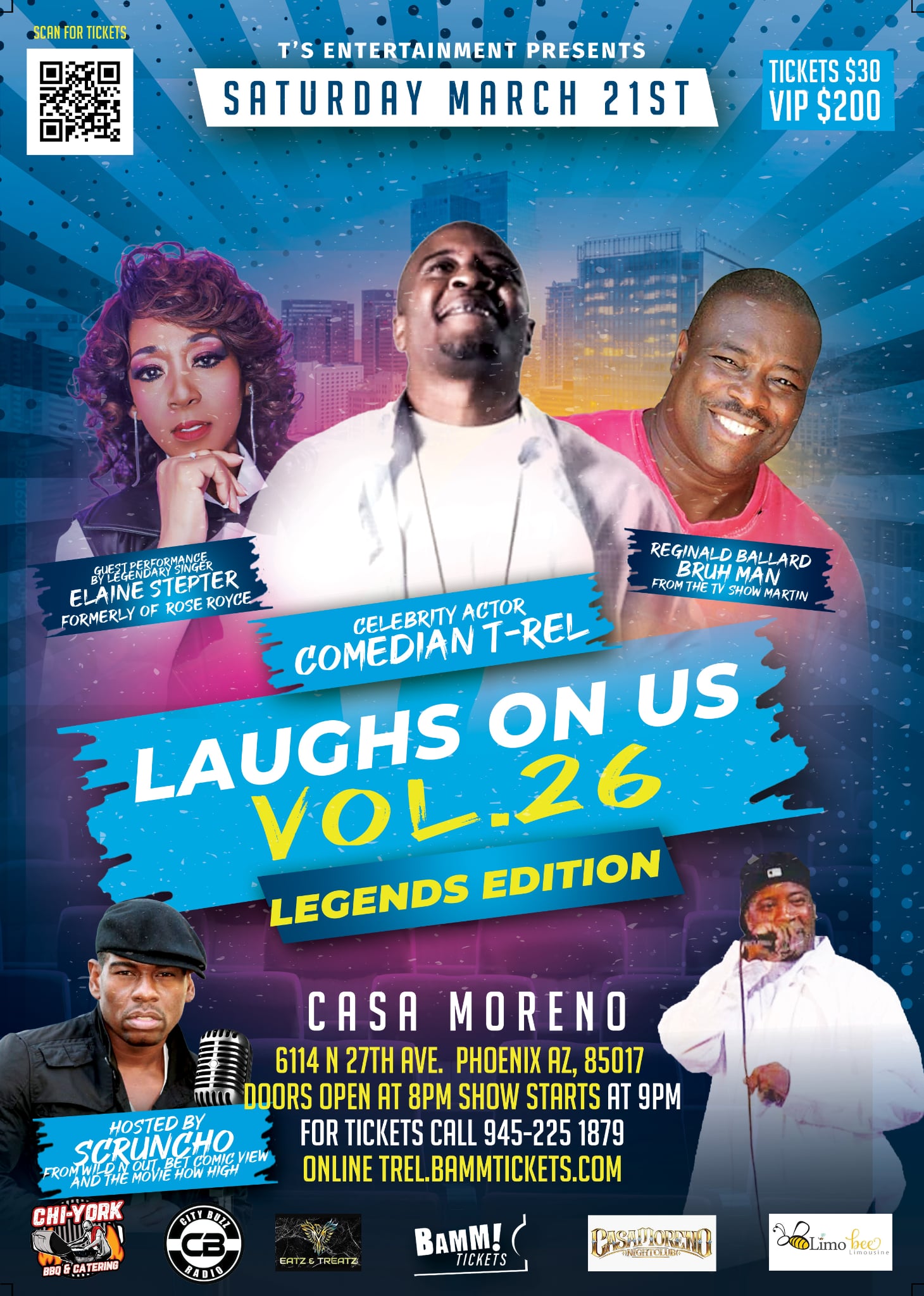 T’S Entertainment presents Laughs On Us Vol.#26@CasaMoreno NightClub 6114 N.27th Ave. Phoenix,Az.85017.Doors open@8pm,Showtime starts@9pm. Hosted by Scrucho from movie How High and BET ComicView, Reginald Ballard also known as Bruh Man from the tv show Martin,Bernie Mac show,Special performance by Legendary R&B singer Elaine Stepter from the group Rose Royce with ya Headliner Celebrity/Actor Comedian T-Rel. Specail performance by TayChapter Six!!!! All hittting one stage for one night only. Tickets available on line TREL.BAMMTICKETS.COM